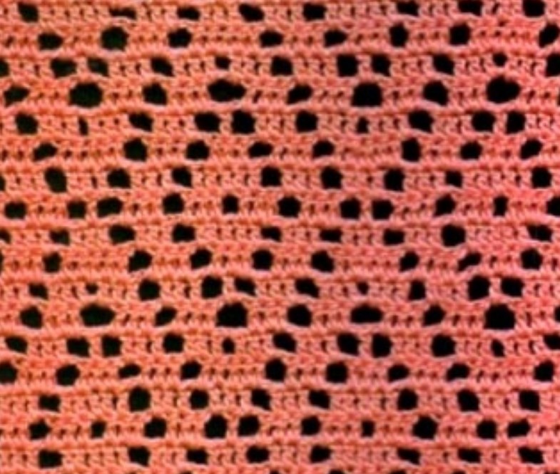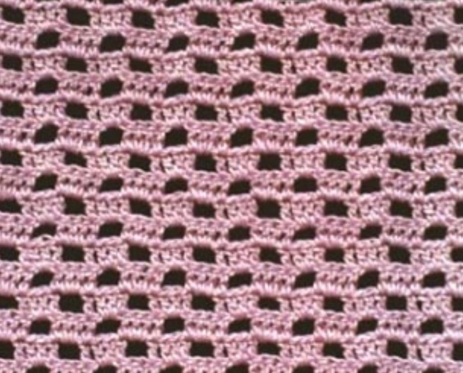 - 1 р.: с. с н. в 6-ю в. п. от крючка (создаем первую ячейку), *1 в. п., пропускаем 1 п., с. с н. в следующую п.*, от * до * до конца ряда (у нас должно получиться 11 клеточек), поворачиваем работу на другую сторону.