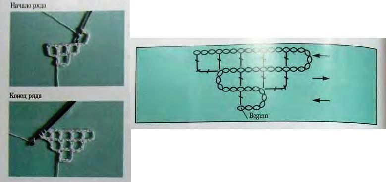 Для того, чтобы уменьшить количество ячеек в начале рядка, переходим соединительными столбиками до нужного нам столбика нижнего рядка и провязываем 5 в. п. п.