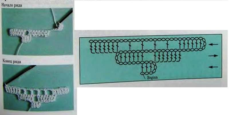 - 1 р.: *3 в. п., 1 с. без н. в 10-ю в. п. от крючка, 3 в. п., пропускаем 2 в. п., 1 с. с н., 5 в. п., пропускаем 5 в. п., 1 с. с н.*, от * до * еще х 1, поворачиваем работу.
