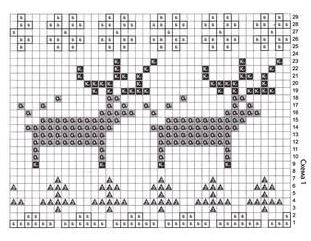 Вязание выполняем по схеме 1, на которой показаны все рядки. По вертикали узор однократно выполняется с 1-го по 29-ый р.