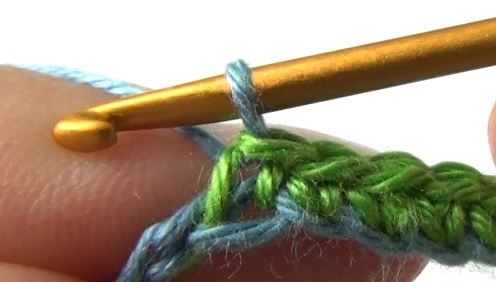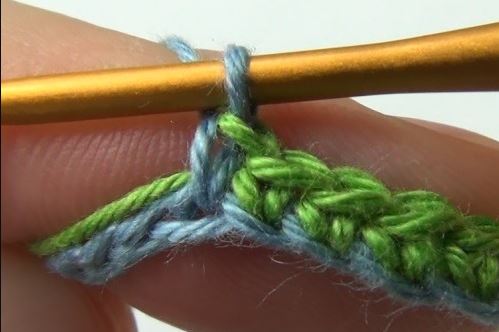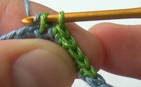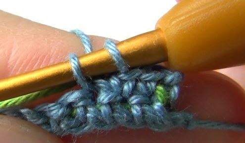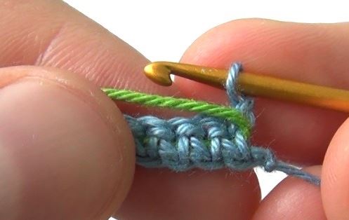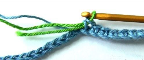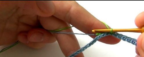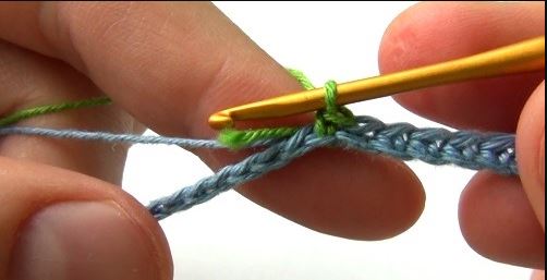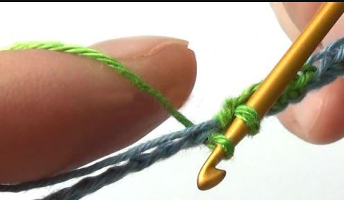 Новый цвет пряжи выполняется на этапе провязывание последнего стлб первого цвета нити. Образуем новую птл вторым цветом.