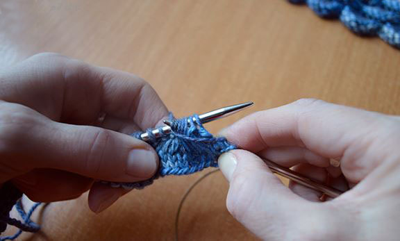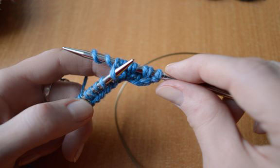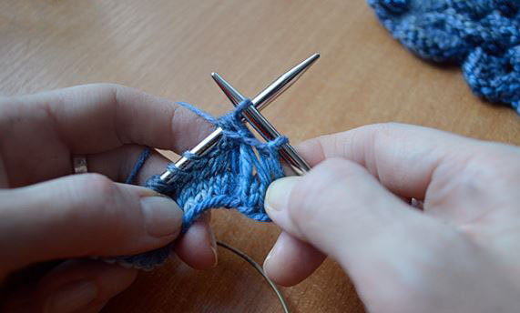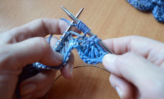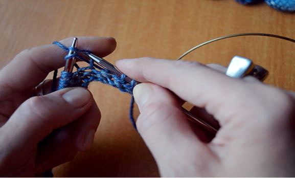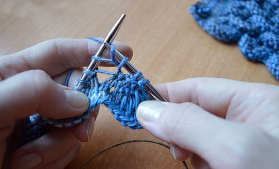 - 2р.: все птл вывязываем лиц/п с двойной обвивкой (= при провязывании каждой птл оборачиваем спицу раб. ниткой дважды).