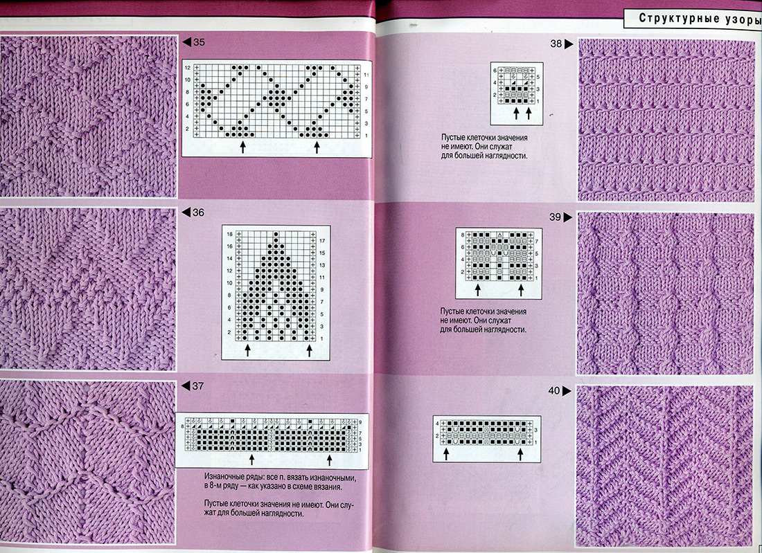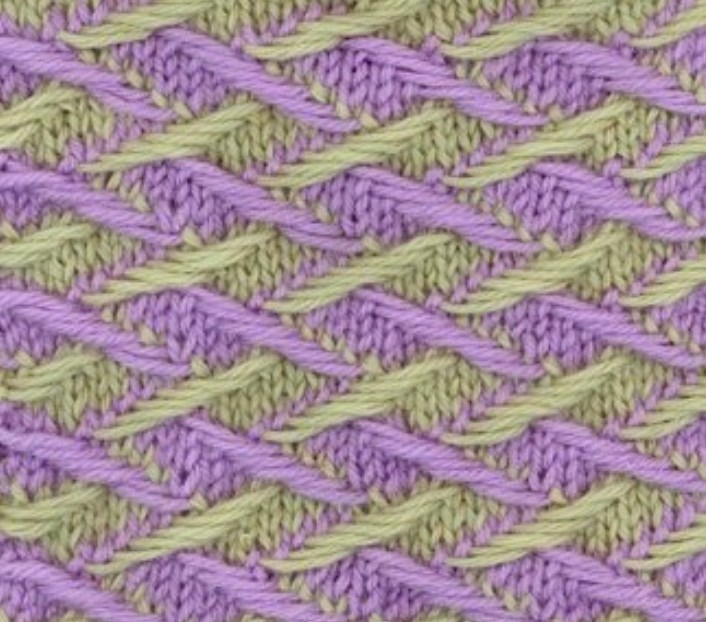 - 3 р. (сиреневая): 1 л. п., *4 п. снимаем без провязки, нить впереди полотна, 4 л. п.*, 1 п. снимаем без провязки, пряжа впереди вязки.