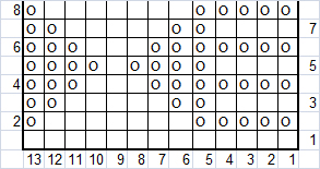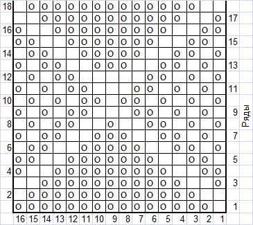 - 14 р. (З): 1 и. п., *4 п. сн., пряжа позади, 4 и. п.*, 1 п. сн. нить позади полотна.