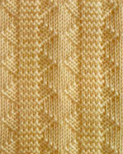 - 18 р.: провязываем по узору, при этом н. делаем лиц. п. без А, захватывая н. сзади (скрещиваем лиц. п.).