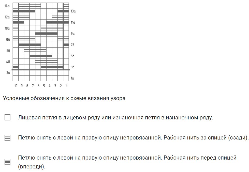 - 9 р.: *2 и. п., 3 л. п., н., 3 л. п., 2 п. вм. изнаночной, 3 и. п., 4 л. п., 3 и. п., 2 п. вм. изнаночной, 3 л. п., н., 3 л. п.*, 2 и. п.