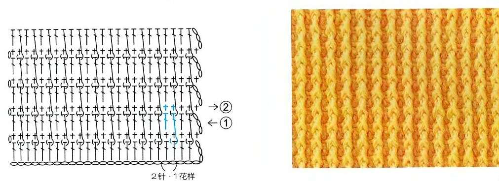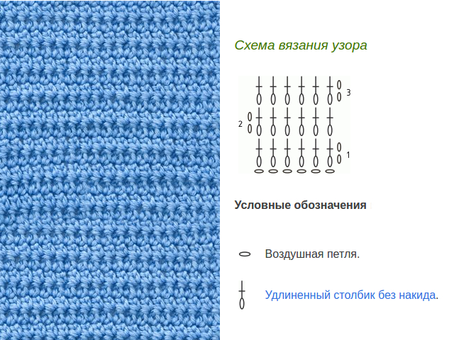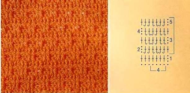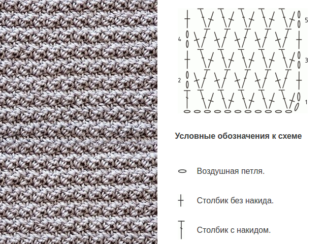 Отличается особой плотностью. Он тянется в длину, но не растягивается в ширину. Рисунок мы провязываем простыми полустолбиками, цепляя петельки за задние стенки наборного ряда. В данном случае нам не надо провязывать в. п. п., но (важно!) первый полустолбик мы провязываем не за заднюю дольку, а за обе дольки первой п. предыдущ. рядка.