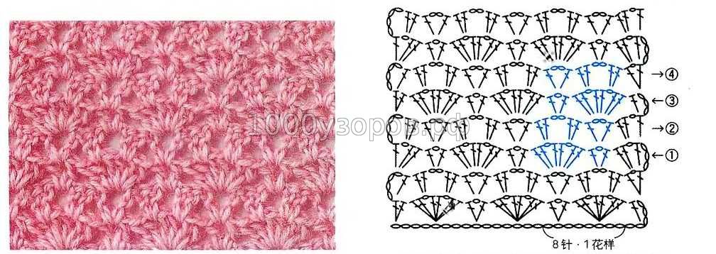 Такие узоры крючком плотные, но при этом ажурные. Они идеальны для шапок, шарфов и зимних кофт, а если использовать пряжу из хлопка, то подойдут и для летних юбочек, моек, платьев, а также и для демисезонных шапок. Помните, что на плотность полотна влияет соотношение толщины пряжи и номера крючка!
