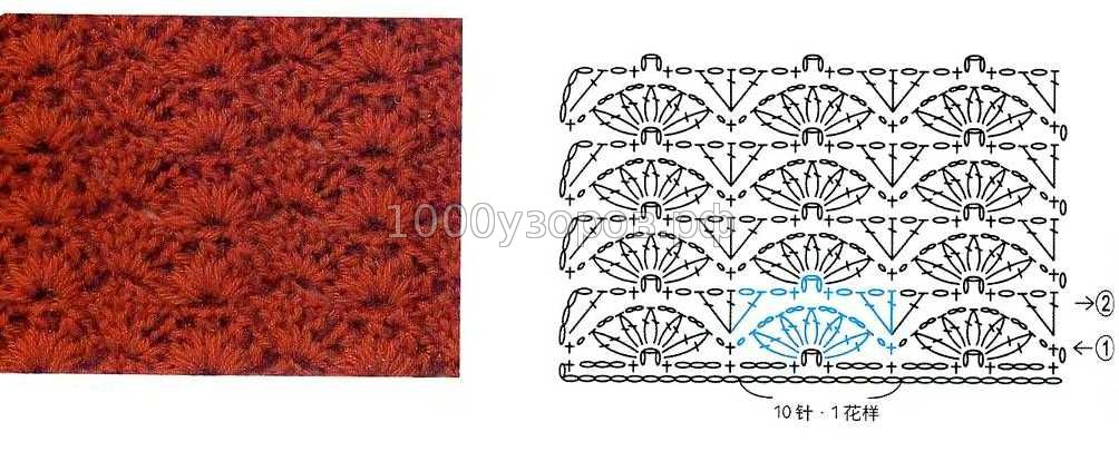 - 1 р.: провязываем с. без н. во 2-ю в. п. от крючка, далее пропускаем 2 в. п. и провязываем 5 с. с н. в одну и ту же след. п. Пропускаем след. 2 в. п. и провязываем с. без н. в 3-ю п., далее пропускаем 2 в. п. и снова провязываем веер. Повторяем эту схему до конца ряда.