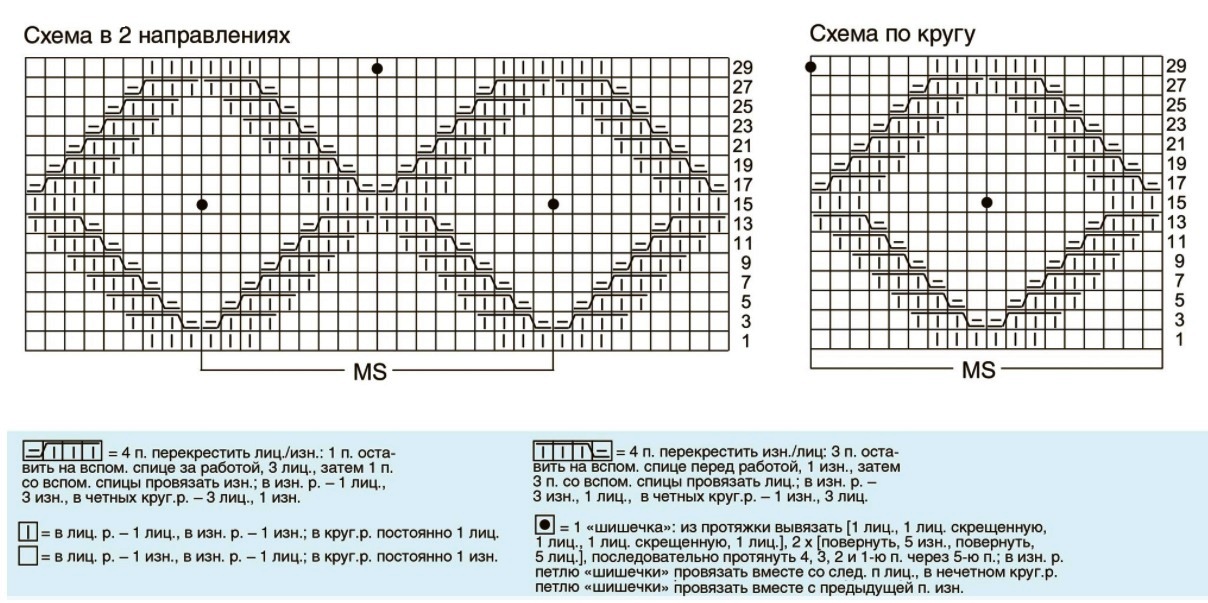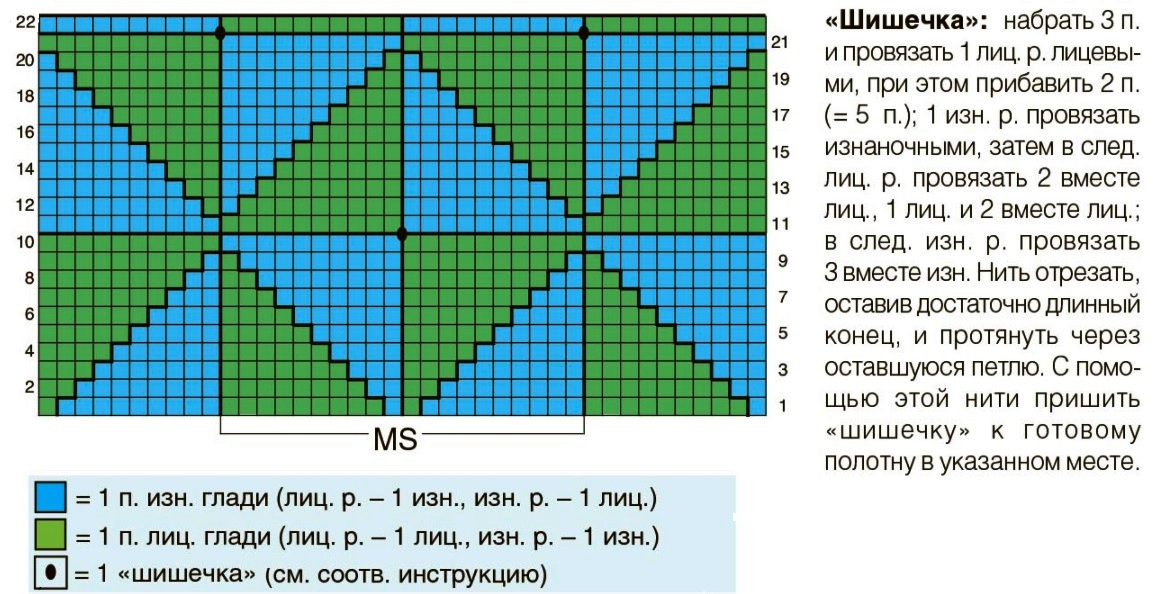 - 29р.: 6и., 3л., *3л., 6и., 1 шишка, 6и., 3л.* – от * и до * повтор до последних 9п., 3л., 6и.;