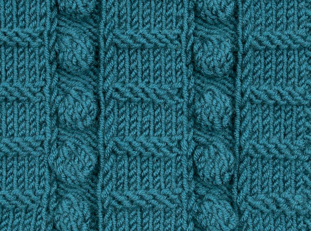Чередование вертикальных дорожек из шишечек с полосками лицевых/изнаночных петелек придает рисунку строгость и красоту.