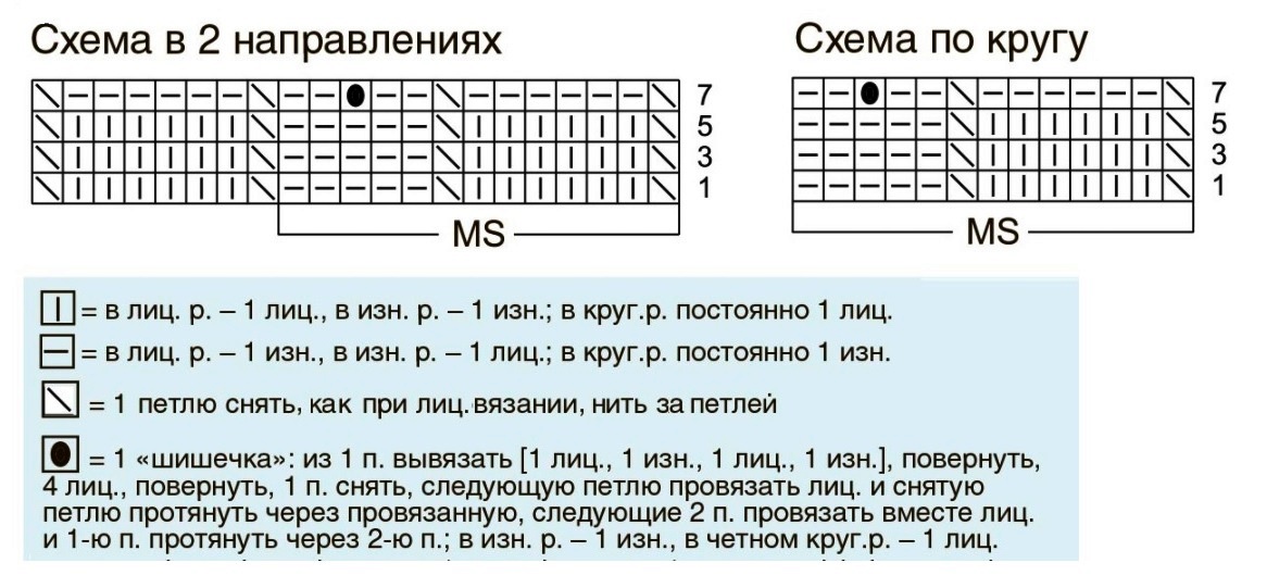 - 7р.: *снятие 1п., 6и., снятие 1п., 2и., 1 шишка, 2и.* – от * и до * делаем до последней петл., снятие 1петл.;