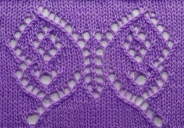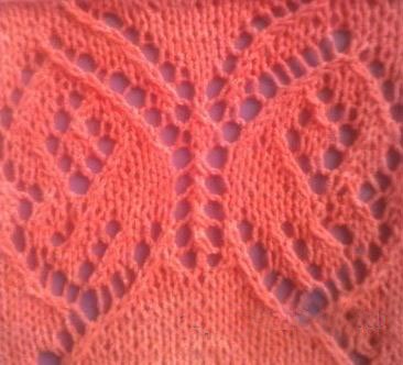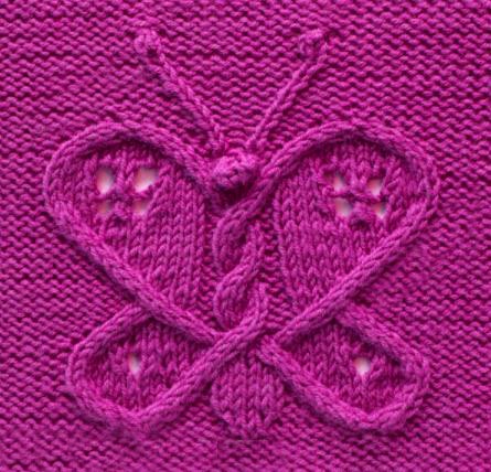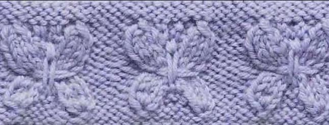 Этим эффектным узором бабочки связанным спицами по схеме и описанию можно украсить кофточку или шапку. Располагать его можно, группируя в стайки или по вертикальной полосе.