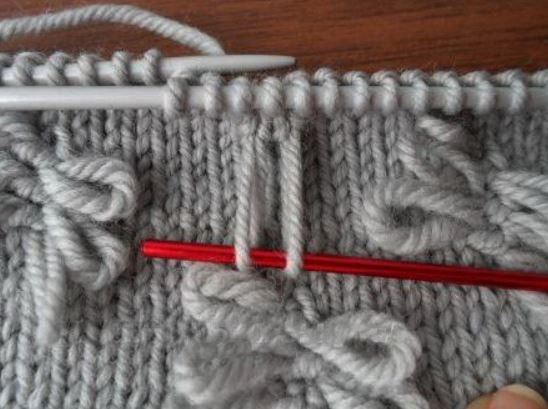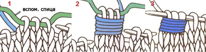 Для выполнения узора нужно владеть приемом обматывания петелек рабочей нитью. Для этого провязываем указанное кол-во петелек, снимаем их на дополнительную спицу. Затем обматываем их рабочей ниткой нужное число раз против часовой стрелки и пересаживаем обмотанные петельки на рабочую спицу. Последовательность действий – см. фото ниже.