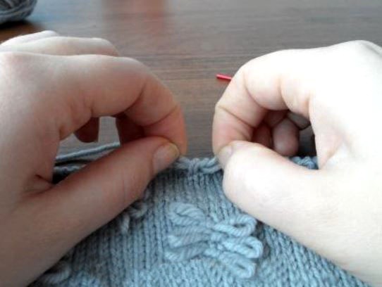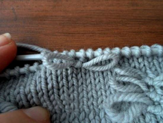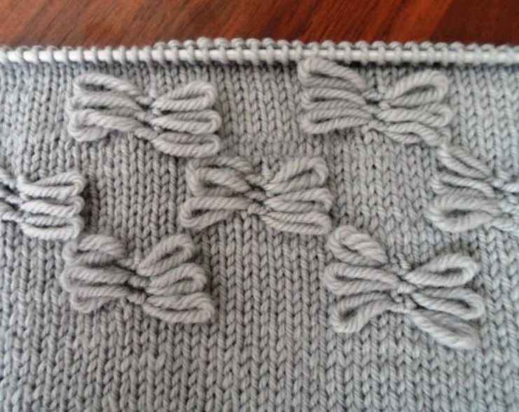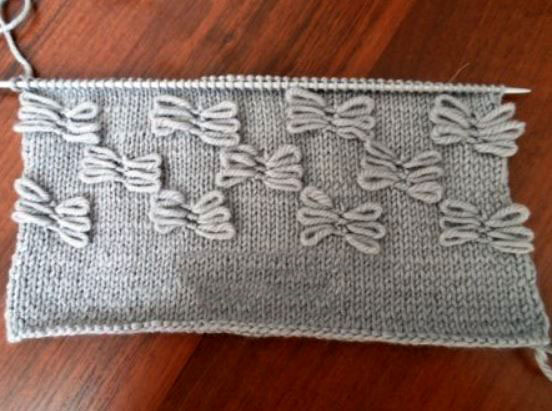 Длинные свободные петельки лучше сразу закрепить. Провязываем после них несколько п. лицевой глади и приступим. Дополнительной спицей или любым подручным инструментом, продетым в петельки, оттягиваем их (см. фото). При этом затягиваются лицев./п. рядка. Завязываем петельки на бантик, закрепляя их. Концы бантика расправляем в стороны.
