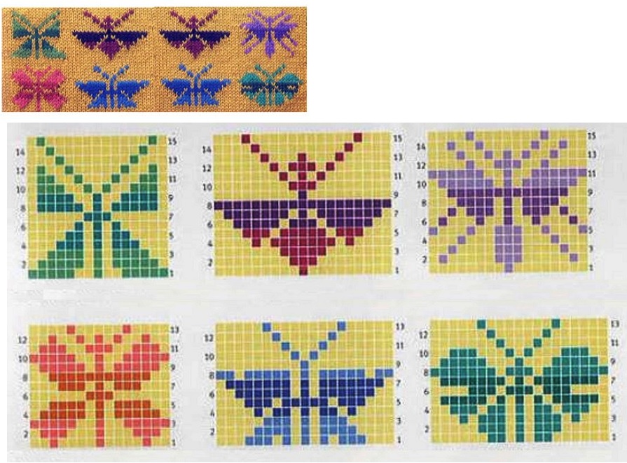 Такими веселыми цветными бабочками можно украсить детские вещи. Для работы можно использовать нитки секционного окраса. Работу будем выполнять по схемам, соблюдая основные принципы жаккардового вязания.