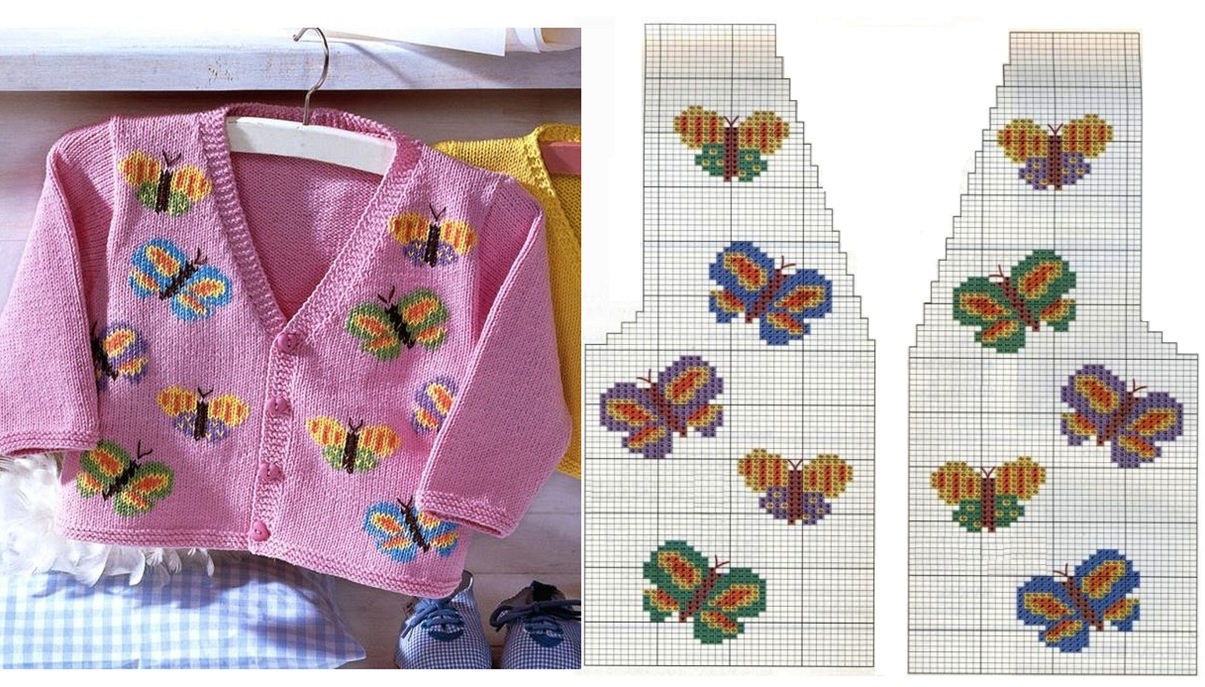 Этот достаточно плотный узор бабочка спицами подходит для многих детских вещей. Также такой мотив может украсить интерьерные подушки, пледы.
