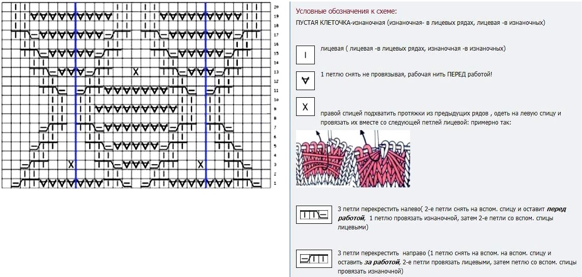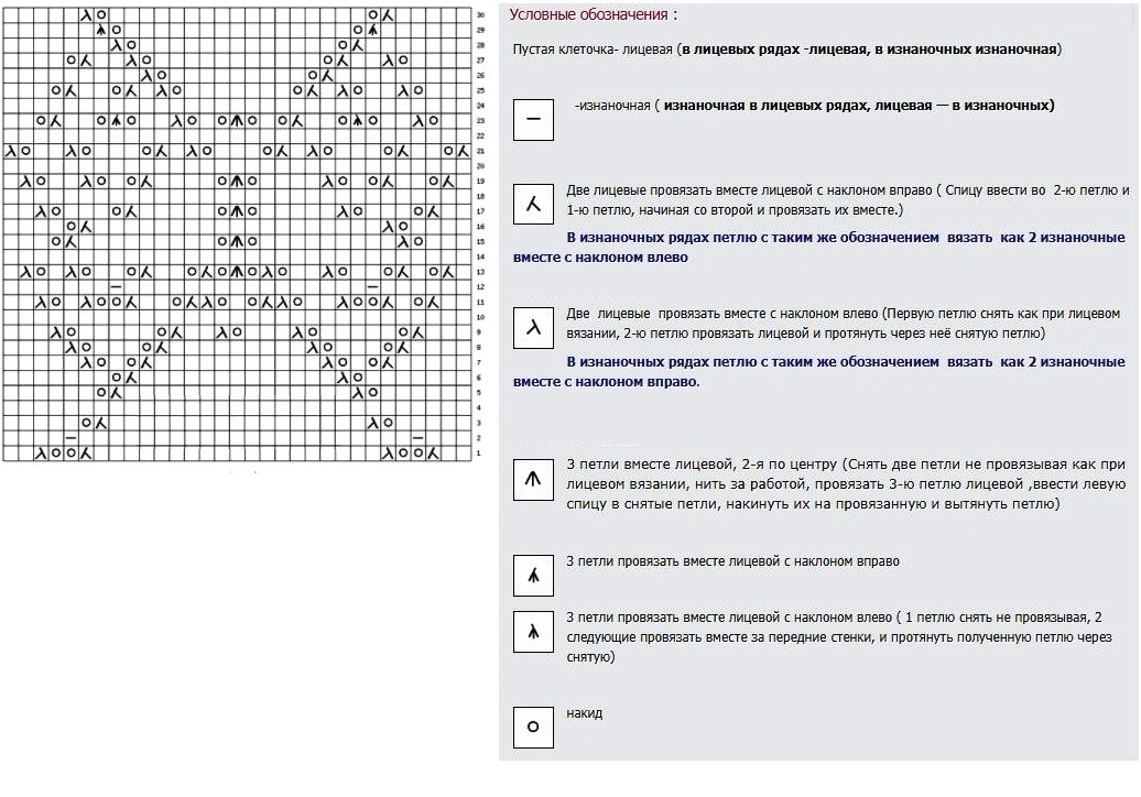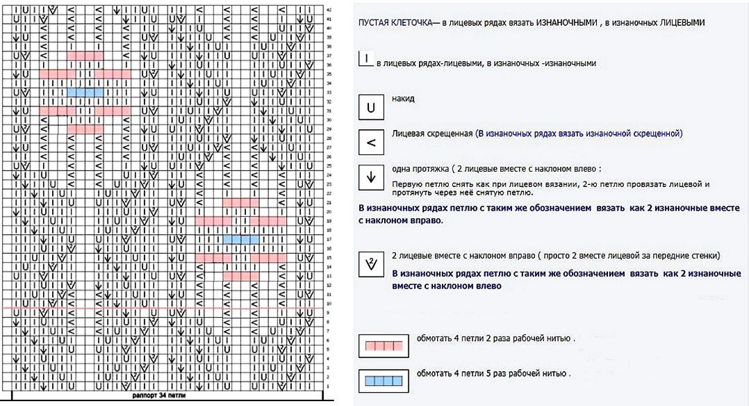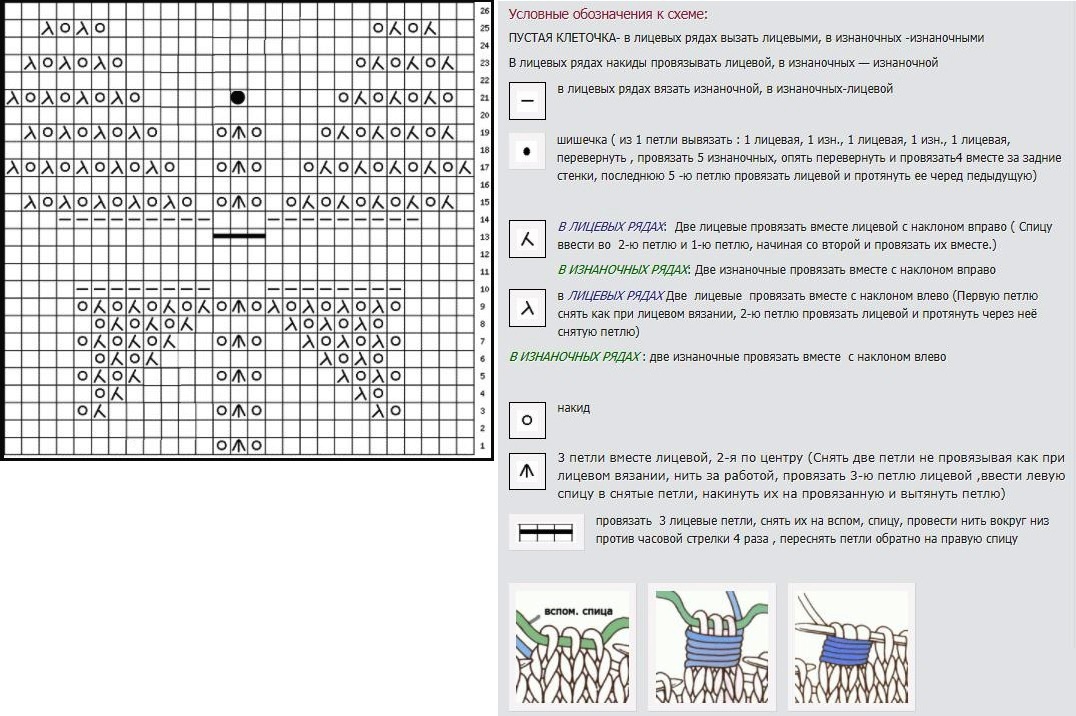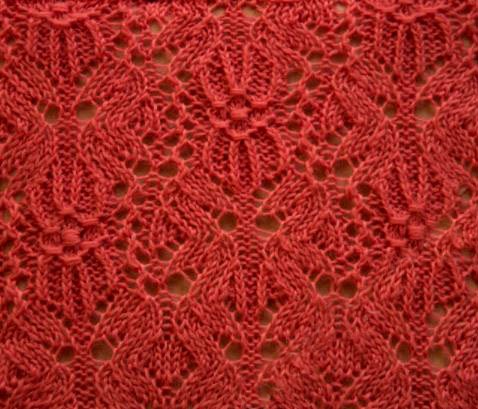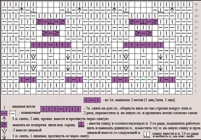 Работа с этим узорчиком требует тщательности и внимания, поскольку размещение накидов и убавок меняется в каждом рядке. Желательно сверяться со схемой и считать кол-во петелек при вязании.