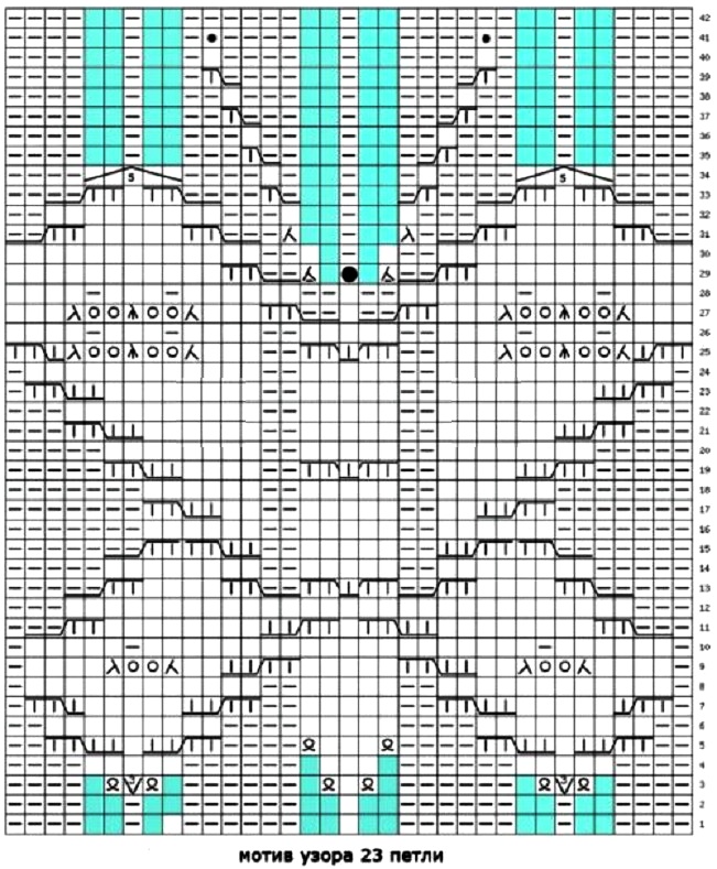 На схеме изображены ЛР и ИР. Горизонтальный Р мотива равен 23п., но кол-во петелек меняется в процессе работы. Вертикальный Р выполняем с 1р. по 42р. Клеточки, обозначающие отсутствие петельки (голубой квадратик) просто пропускаем, перейдя к выполнению следующего элемента.