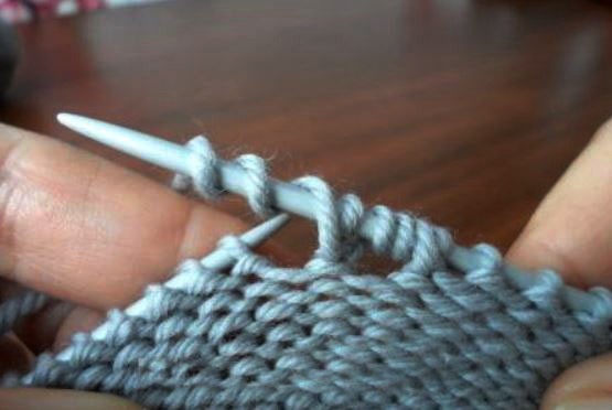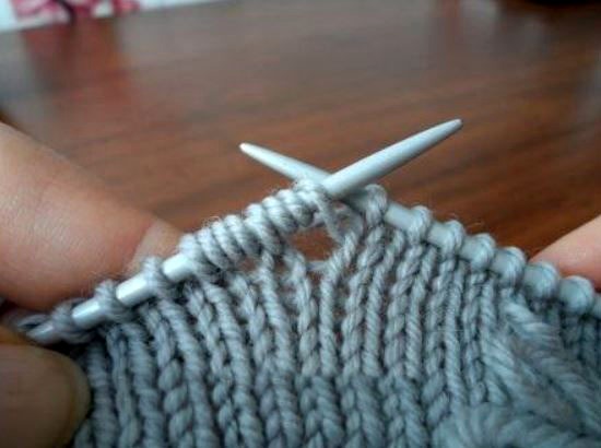 - 20р.: 1 кром., 7 изнаночн., правую сп. заводим за работу, за пять протяжек, подхватываем все и пересаживаем на левую сп., провязываем все пять в 1 изнаночн., 1 изнаночн., перебрасываем предыдущую п. через последнюю (итоге из 2-х п. остается 1 п.), 1 кромочн.