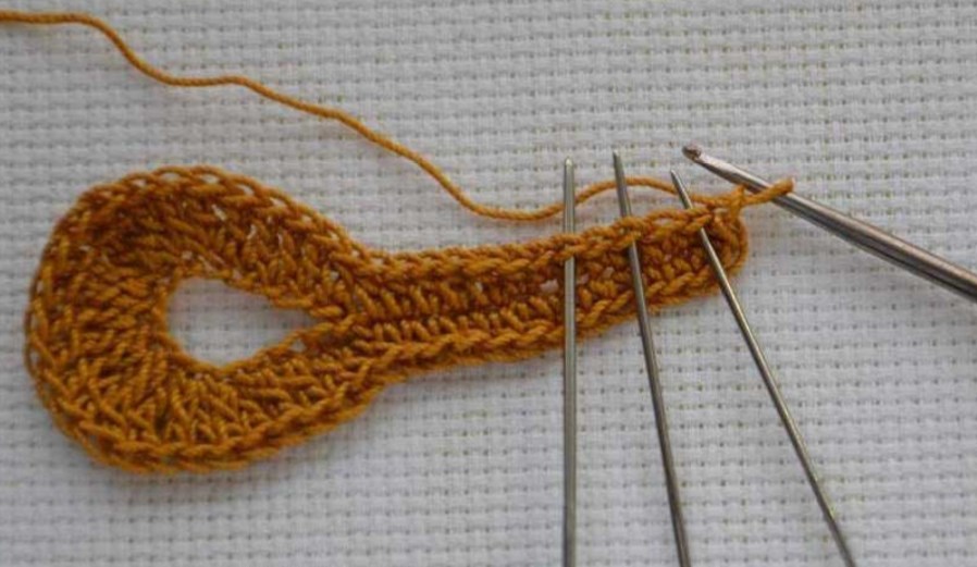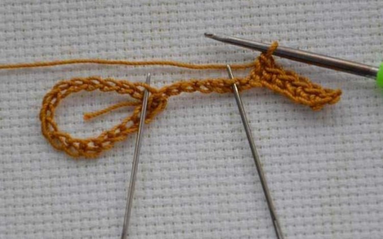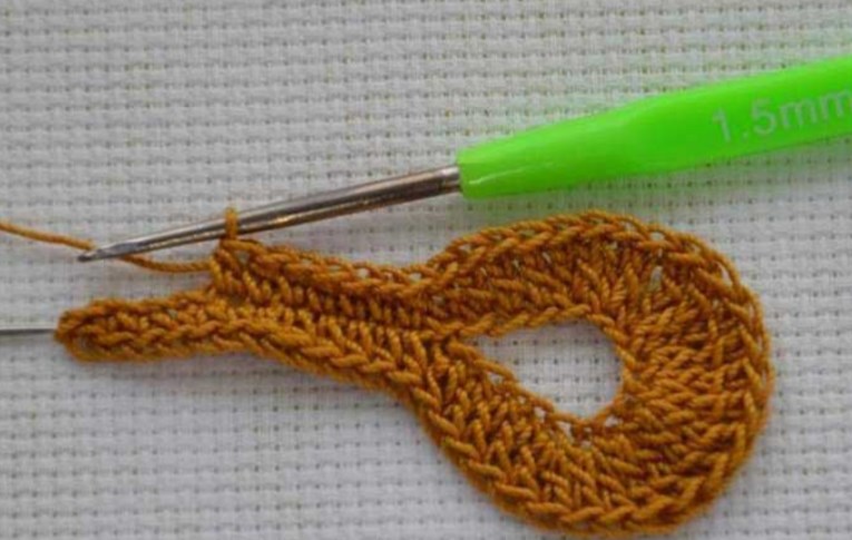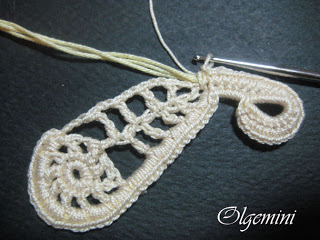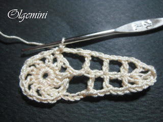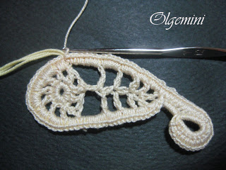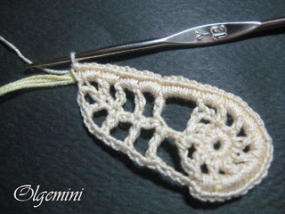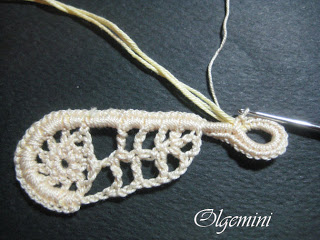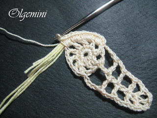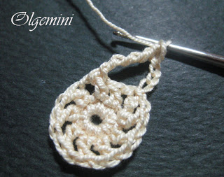 Связав до острого кончика на нитках бурдона, набираем 18-20 с. без н. и соединяем их в небольшое колечко, отступая от кончика мотива 5-6 петелек.