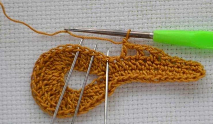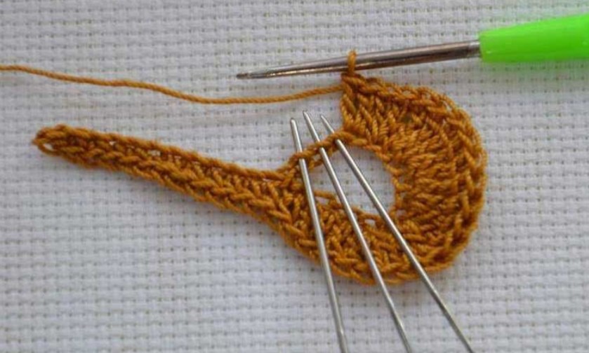 - 5 р.: начинаем вывязывать «хвостик» огурчика, используя технику тунисского вязания: выполняем за заднюю стеночку с. без н. 9 ст. (фото 4).