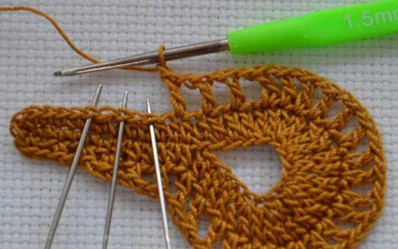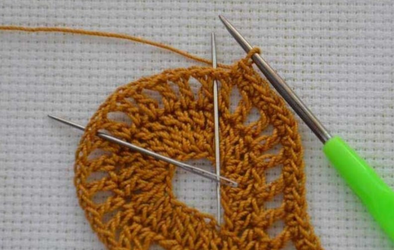 Вяжем третий ряд: обвязываем заготовку столбиками без накида. До места, отмеченного иголкой, вяжем по 1-му с. без н. в каждый столбик и по 1-му с. без н. под каждую из в. п.