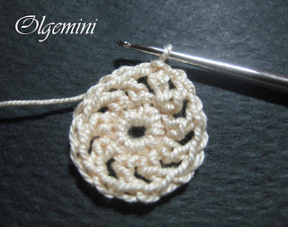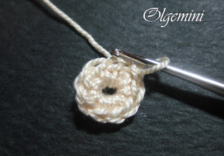 - 1 р.: провязываем 9 с. без н. в центр кольца.
