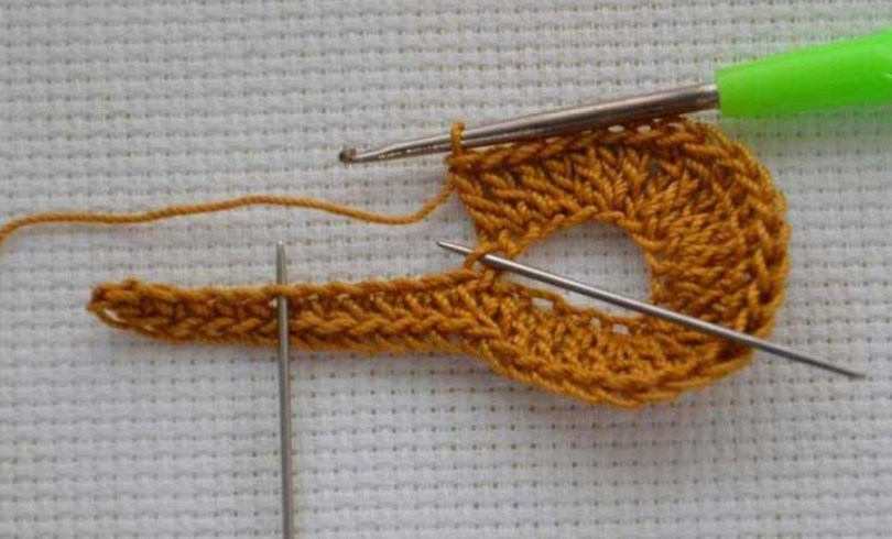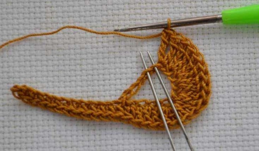 - 6-9 рр.: вяжем тунисским способом, формируем округлость с помощью убавлений слева по одному ст. в каждом ряду (фото 5).