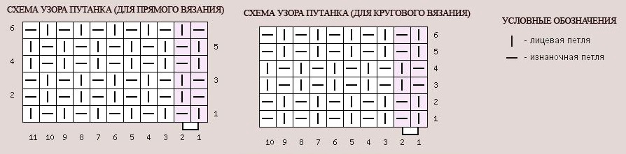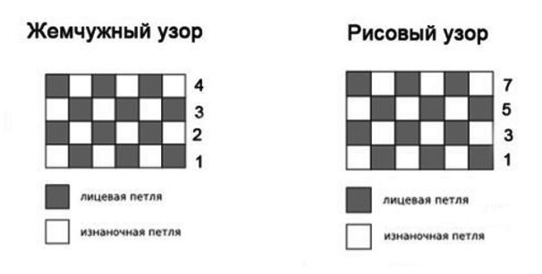 Оба варианта создаются комбинацией лицевых и изнаночных петелек, оба имеют поверхность полотна с бугорками. Только для жемчужного узорчика эти бугорки равномерные и напоминают жемчужинки, а для рисуночка рис – продолговатые, напоминающие рисовые зернышки. Давайте сравним схемы узоров.