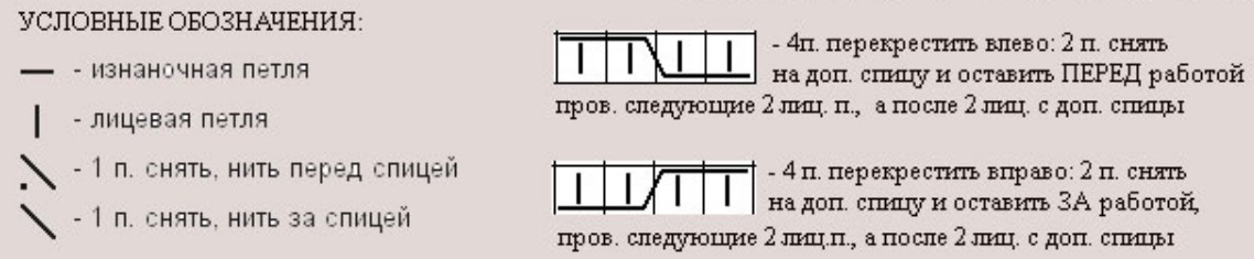 - 5 р.: *3 п. скрещенных вправо (2 и. п. сн. на всп. сп. позади, 1 л. п., далее 2 п. со всп. сп. изнаночными), 3 п. скрещенных влево (1 п. на всп. сп. спереди, 2 и. п., 1 п. со всп. сп. вяжем л.*, от * до *.