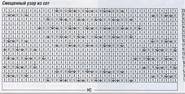 Раппорт составляет 12 п. и 12 р. в высоту. Схема узора соты отображает и лицевые, и изнаночные ряды.