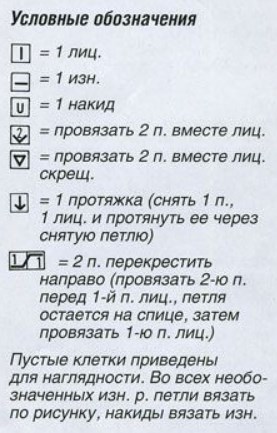 - 2 р. (лицо): 1 и. п., *сн. 3 п., нить перед работой, 3 и. п.*, от * до 4- крайних п., сн. 3 п., нить перед работой, 1 и. п.