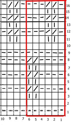- 16 р.: 1 и. п., *2 п. сн., нит. над вязкой, 4 и. п.*, от * до *.