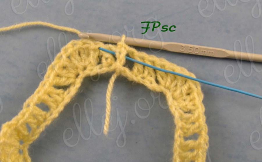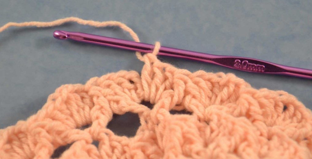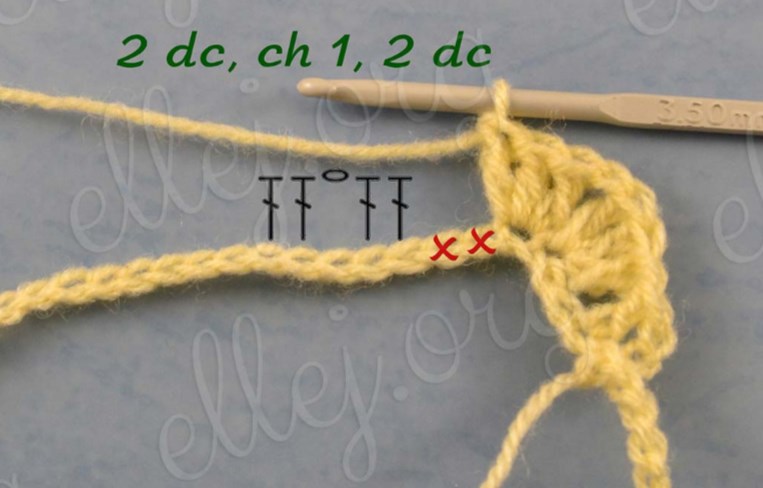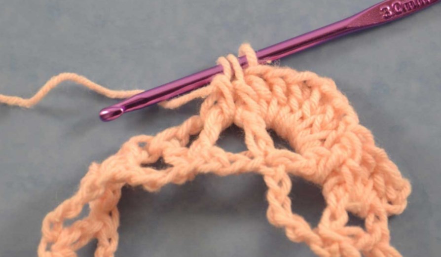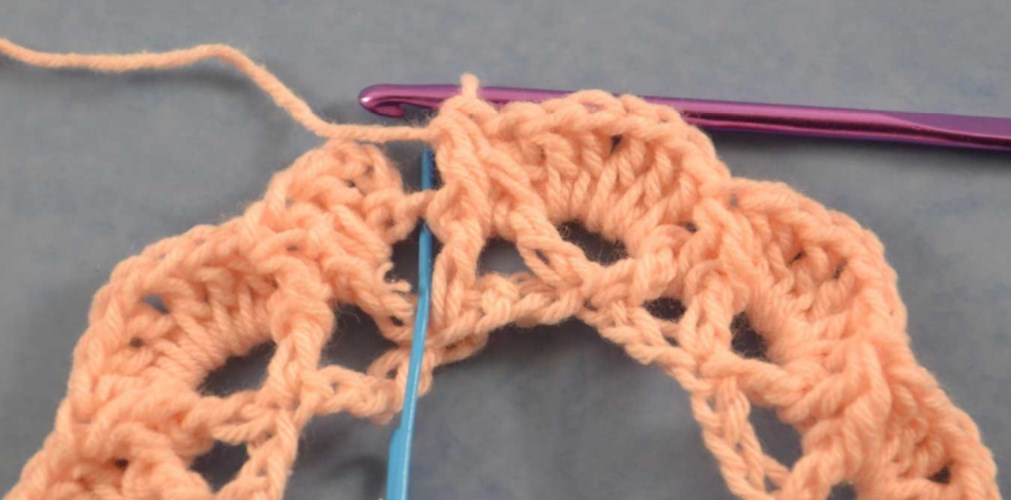 Продолжаем вязание таким же образом: пропускаем 1 с., делаем по одному с. с н. во 2-ю и 3-ю п. от кр., 1 лиц. р. с. с 2 н. под только что пропущенный с. Р. замыкаем, как обычно, с помощью сс. в третью в. п. п.