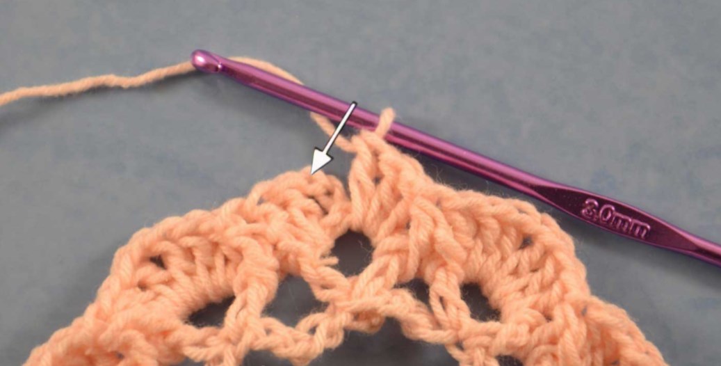 В конце р. в первую арочку ввязываем 1 с. с н., после чего набираем 1 в. п., соединяем р. с. без н. в 3-ю в. п. п.