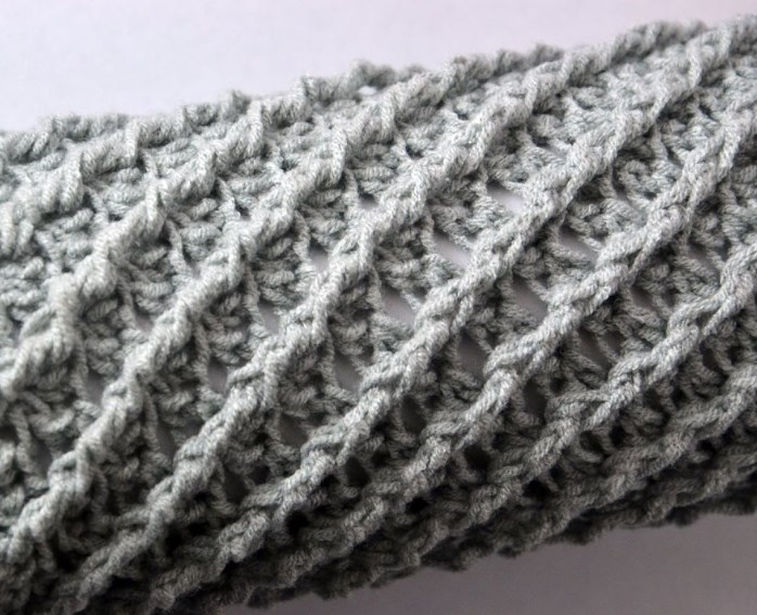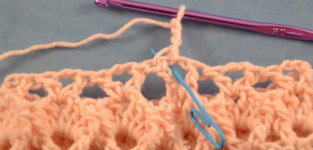 Пропускаем один столбик и снова вяжем по одному с. с н. во 2-ю и 3-ю п. от кр. Повторяем таким же образом до конца р.