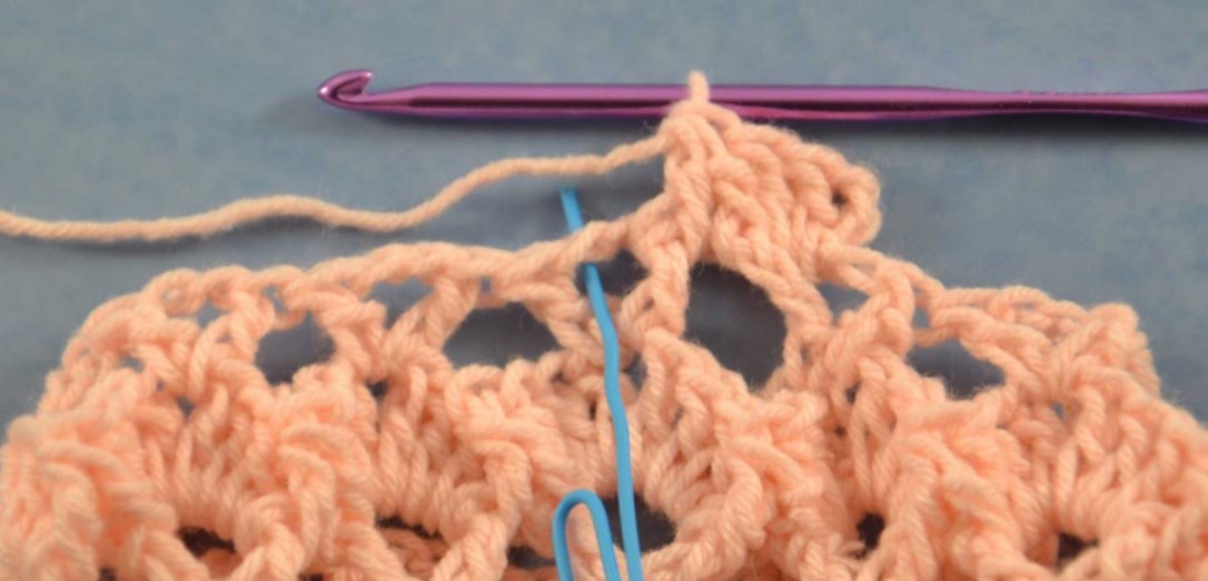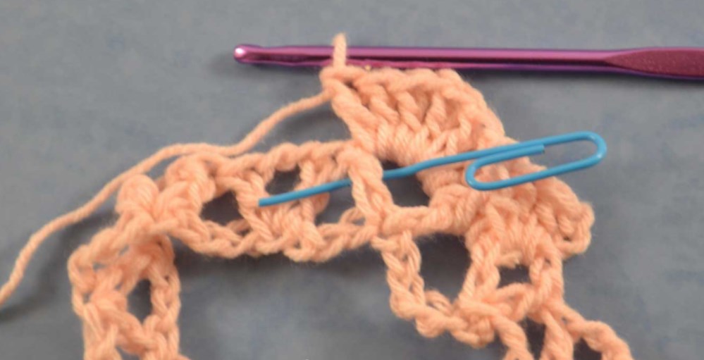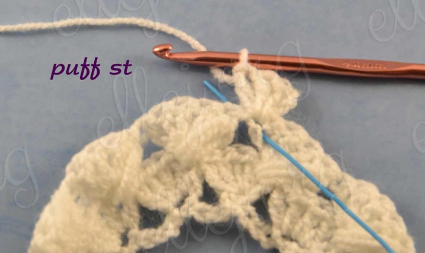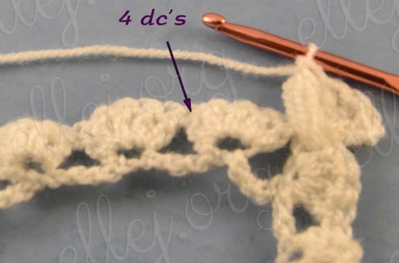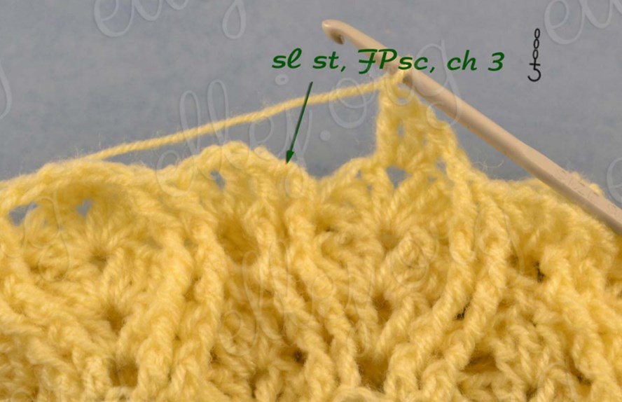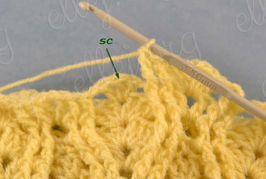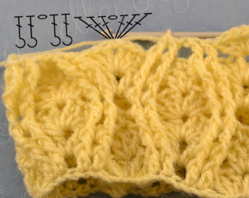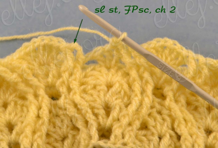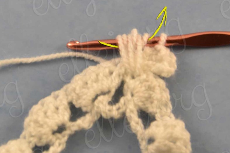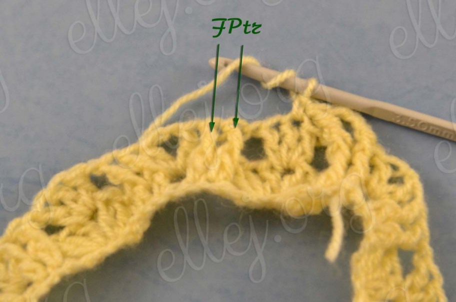 3 в. п. п., затем р. из рогаток (с. с н., 2 в. п., с. с н.) в каждую ракушечку (обратите внимание на фото!).