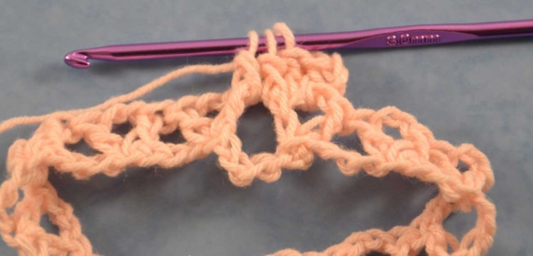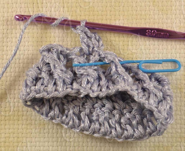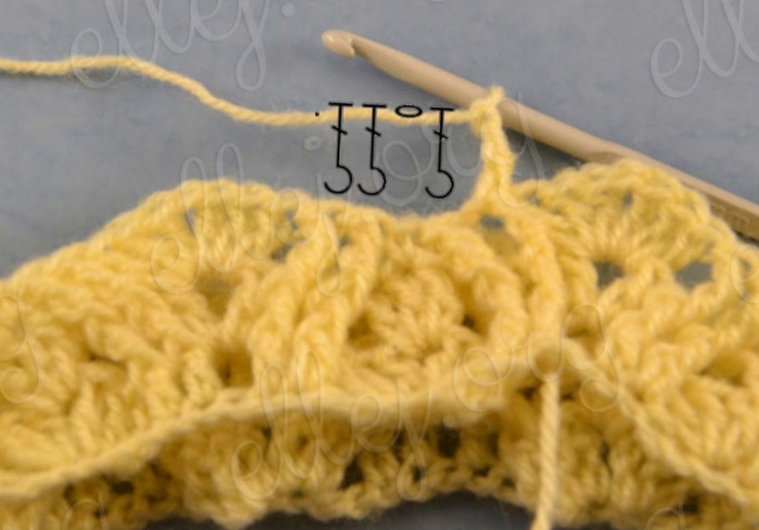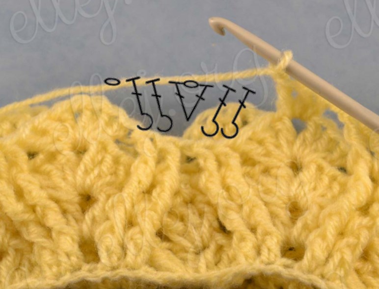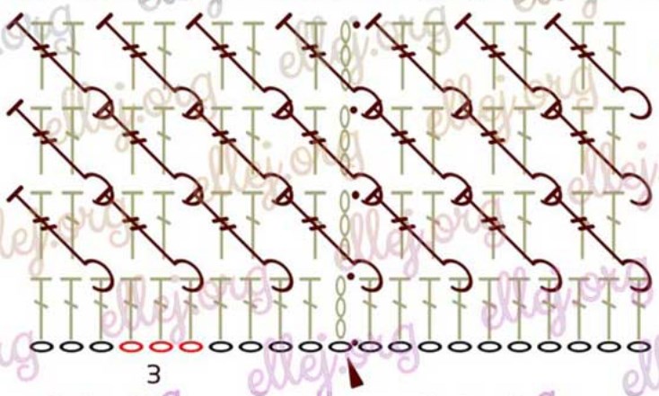 Набираем 3 в. п. п., 1 с. с н. в сл. п., пропускаем 2 п., в сл. п. выполняем 3 с. с н., 1 в. п., и 3 с. с н. в сл. п.