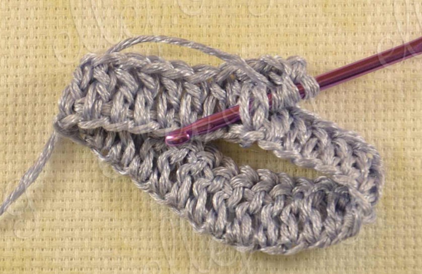 Вяжем обе петельки на крючке (у нас выходит лицев. р. с. без н.) и наб. 2 в. п. Так мы осуществляем переход на все дальнейшие рр.