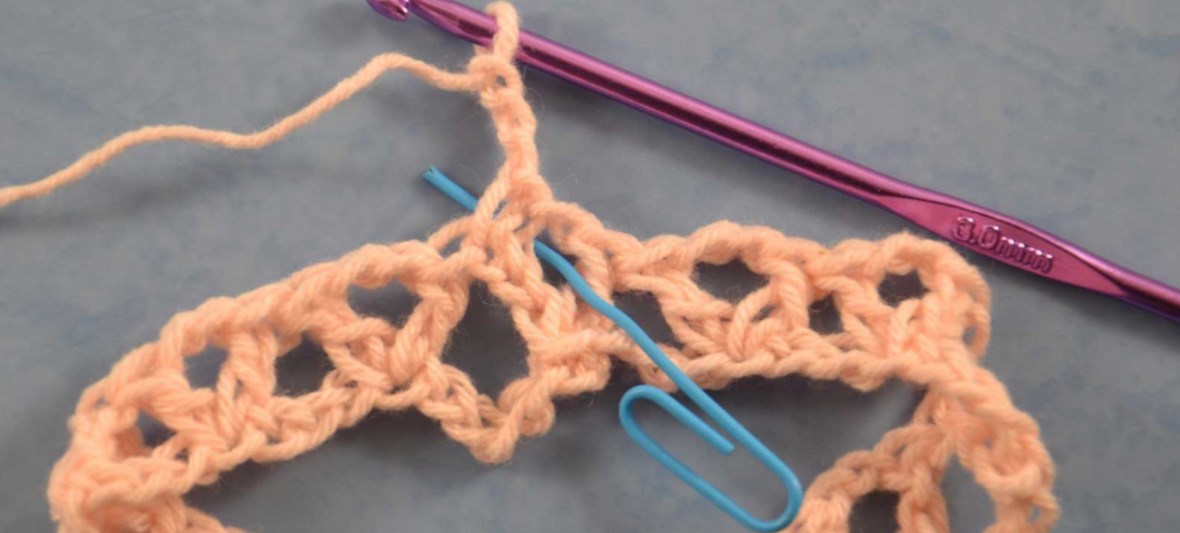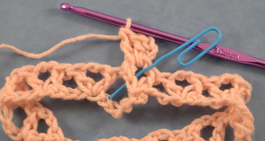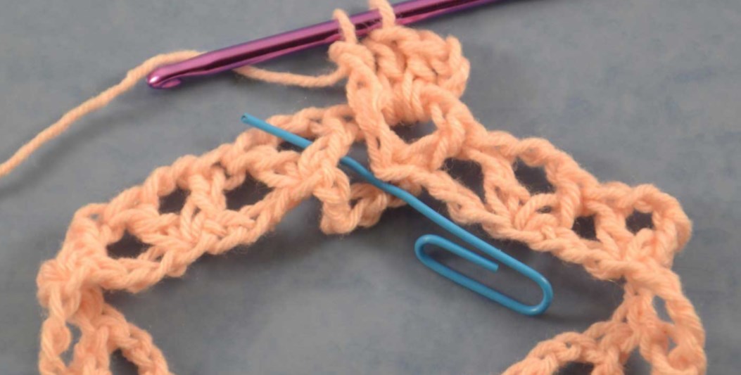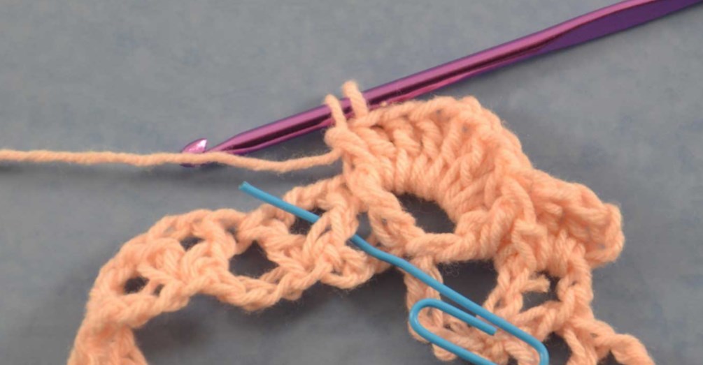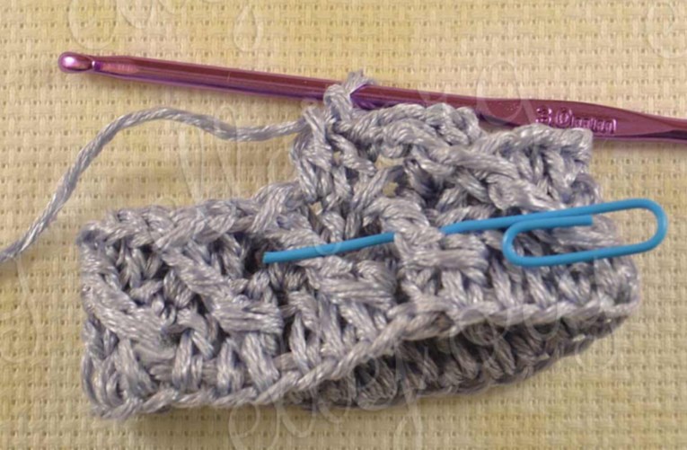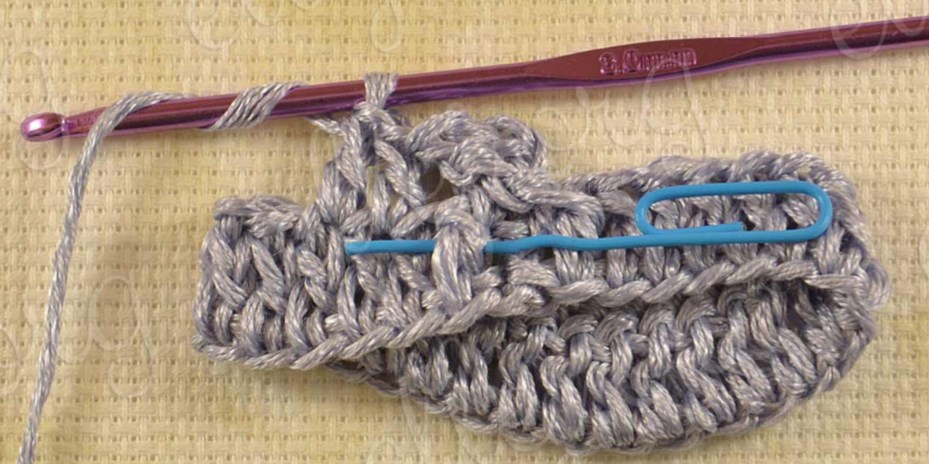 Это делается так: вводим кр. под с., захватываем нитку и тянем петельку. Далее – как обычный с. с н., но не довязываем его до конца. Под указанный скрепкой с. провязываем рельефный лицевой незаконченный.