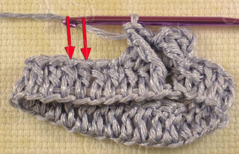 После этого провязываем все оставшиеся петельки р. попарно: нитку захватываем и протягиваем сквозь две крайние петельки на кр., опять захватываем нитку и снова вытягиваем петлю сквозь две крайние петельки, повторяем то же самое еще раз. Пропускаем один столбик нижнего р. и делаем по одному с. с н. во 2-ю и третью п. от кр. Теперь выполняем лицевой рельефный с. с 2 н. под пропущенный столбик, вот так: