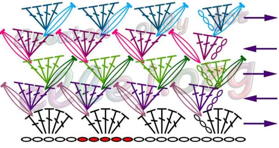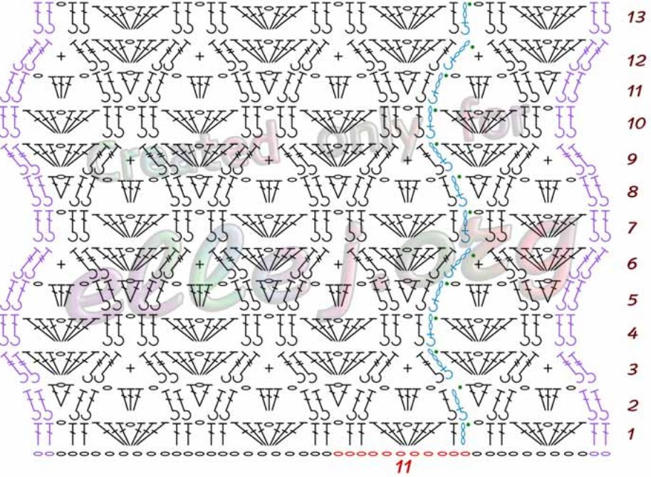 Здесь все рельефн. с. провязываем с двумя накидами. л. р. с. с 2 н., ракушка в галку.