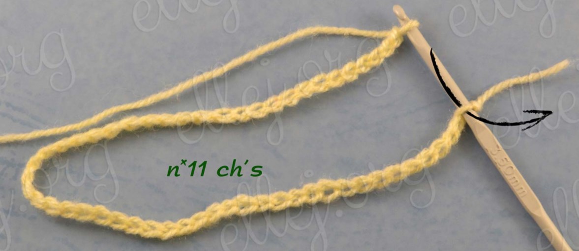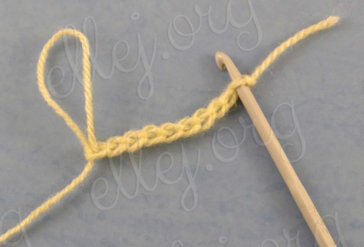 Набираем цепочку из воздушных петель, их число должно быть кратным 11. Если вы боитесь, что цепочка перекрутится, после набора первых петелек вводим крючок в самую первую петельку, подхватываем снятую петлю и продолжаем набор. Затем вытягиваем крайнюю петельку сквозь первую и смыкаем цепь.