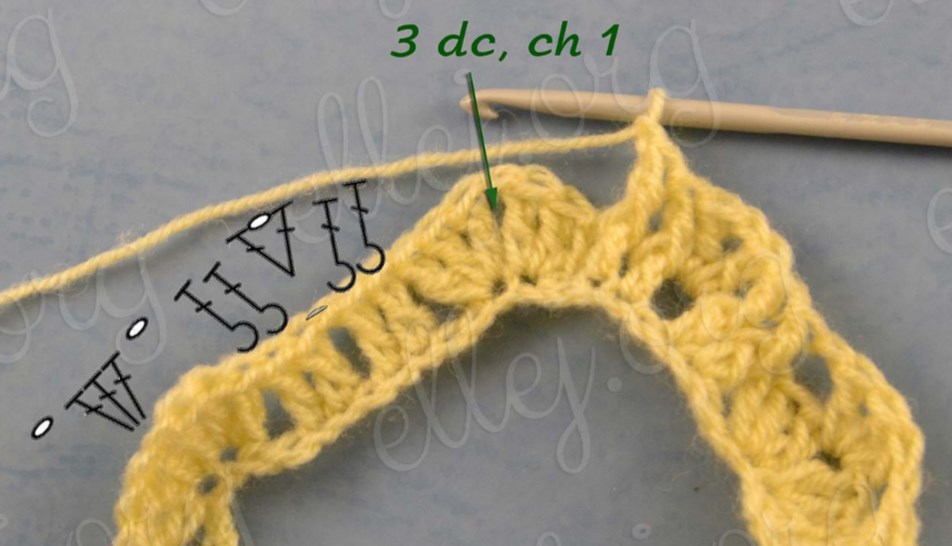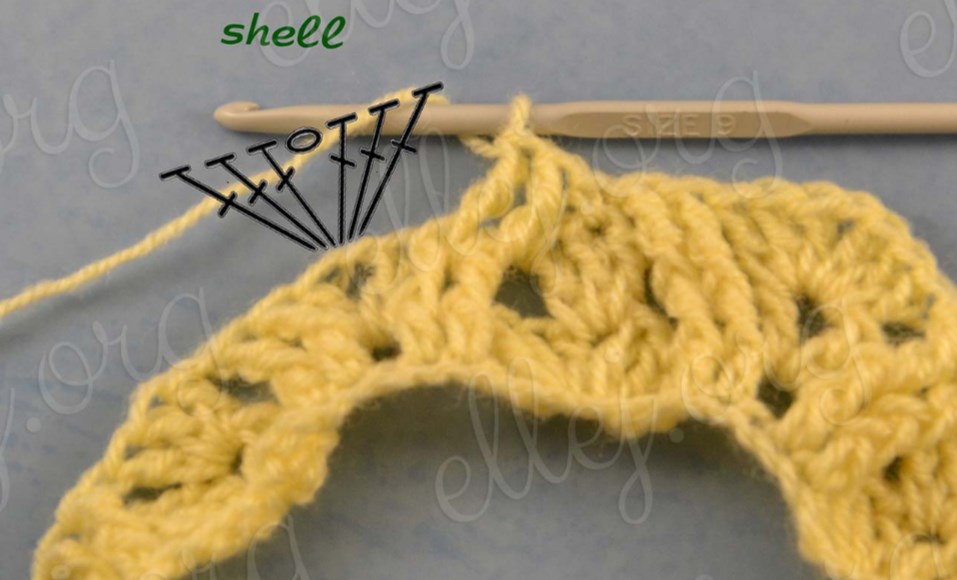 В арки ввязываем ракушки: 3 с. с н., 1 в. п., 3 с. с н.