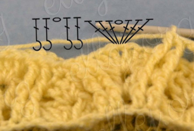 Поворачиваем работу на изн. сторону и вяжем в обратном направлении. 3 с. с н. в место соединения нижнего р., 1 пышн. с., вводя кр. между 2-мя крайними с. на ракушке нижнего р.