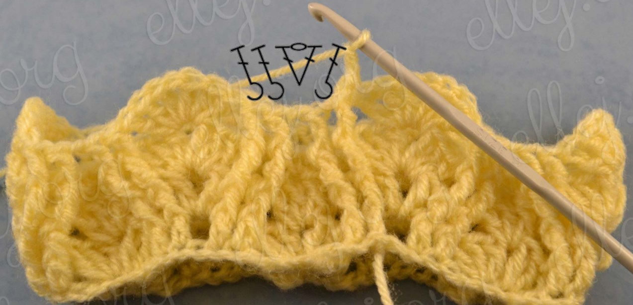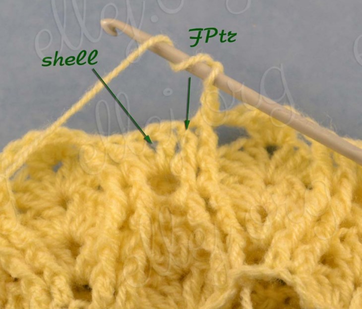 Чередуем до конца р. ракушечку в ракушку нижнего р. и группу из 2 л. р. с., 1 в. п., 2 л. р. с.