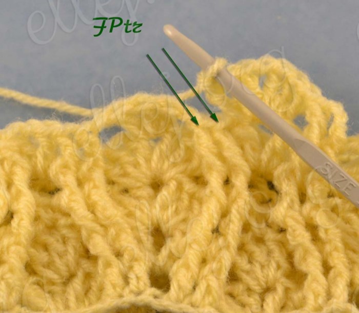 Накид, вводим крючок, как на фото ниже. Пряжу захватываем и вытягиваем на высоту нового р.