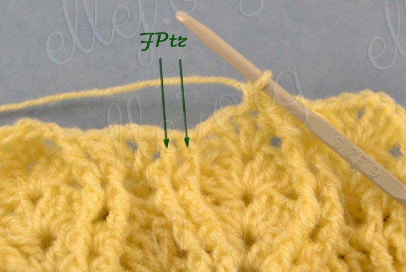 Набираем 3 в. п. п., провязываем 1 с. с н. в следующий с. с н. предыдущего р., затем вяжем лицевой рельефный столбик с 2-мя накидами под последн. столбик нижнего р. (помечено скрепкой).