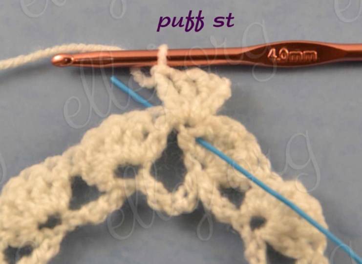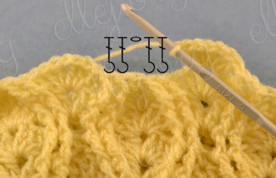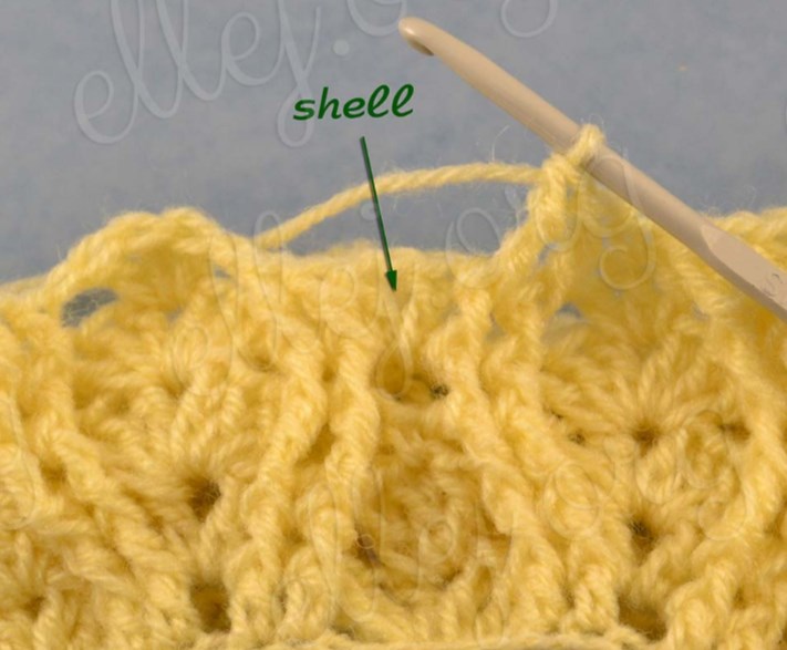 И опять пышн. с. между 4 и 5 с. на ракушке, 4 с. с н., пышн. с., повт. до конца, сс. в 3-ю в. п. п., наб. 3 в. п.